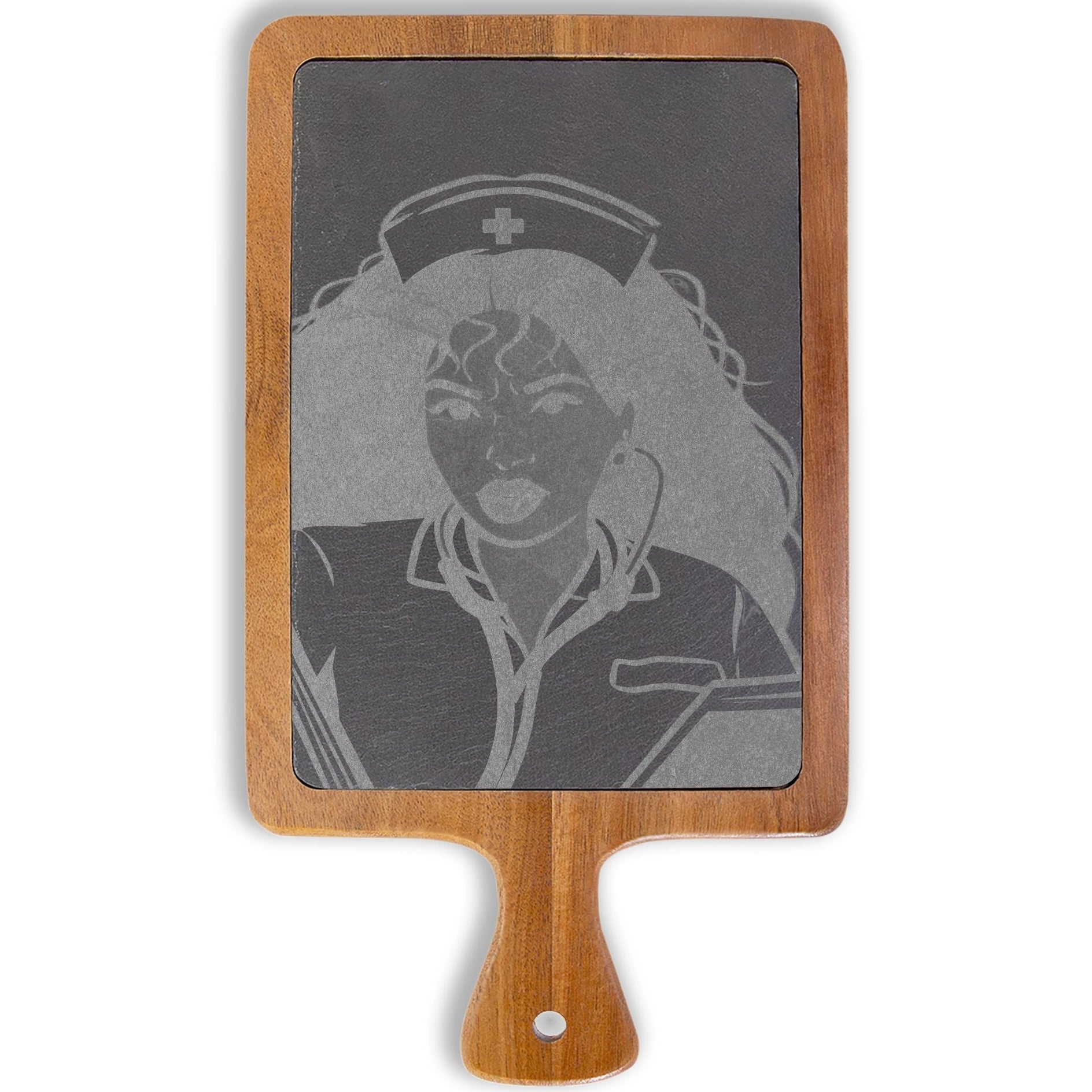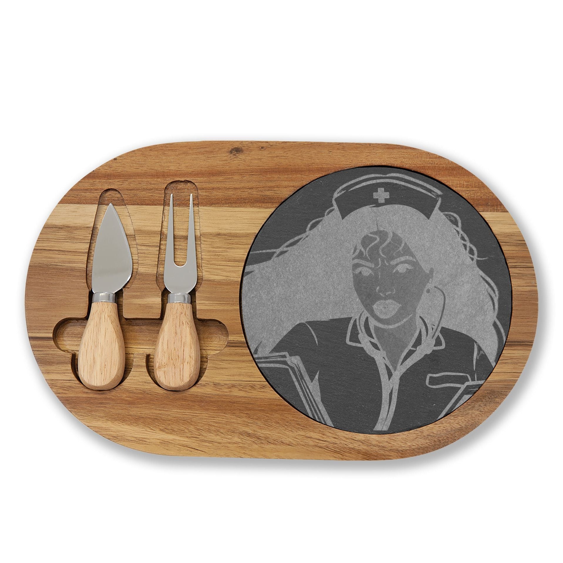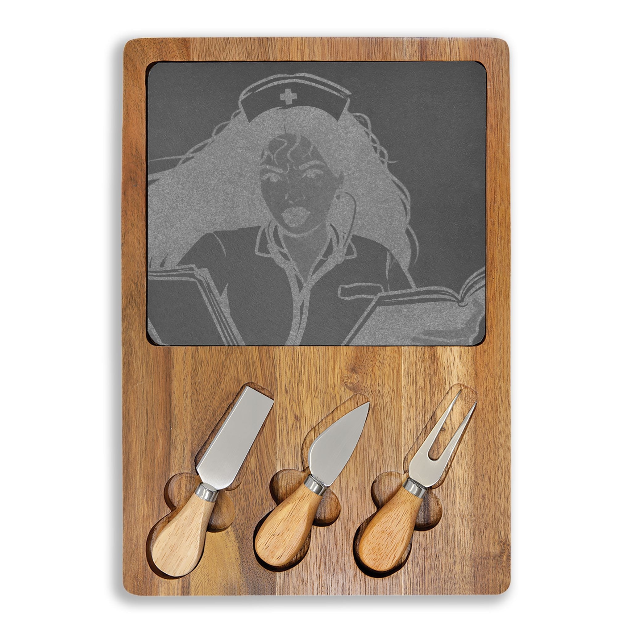 Engraved Nurse Portrait Charcuterie Board – Bamboo Cheese Serving Platter with Slate Inset & Knife Set