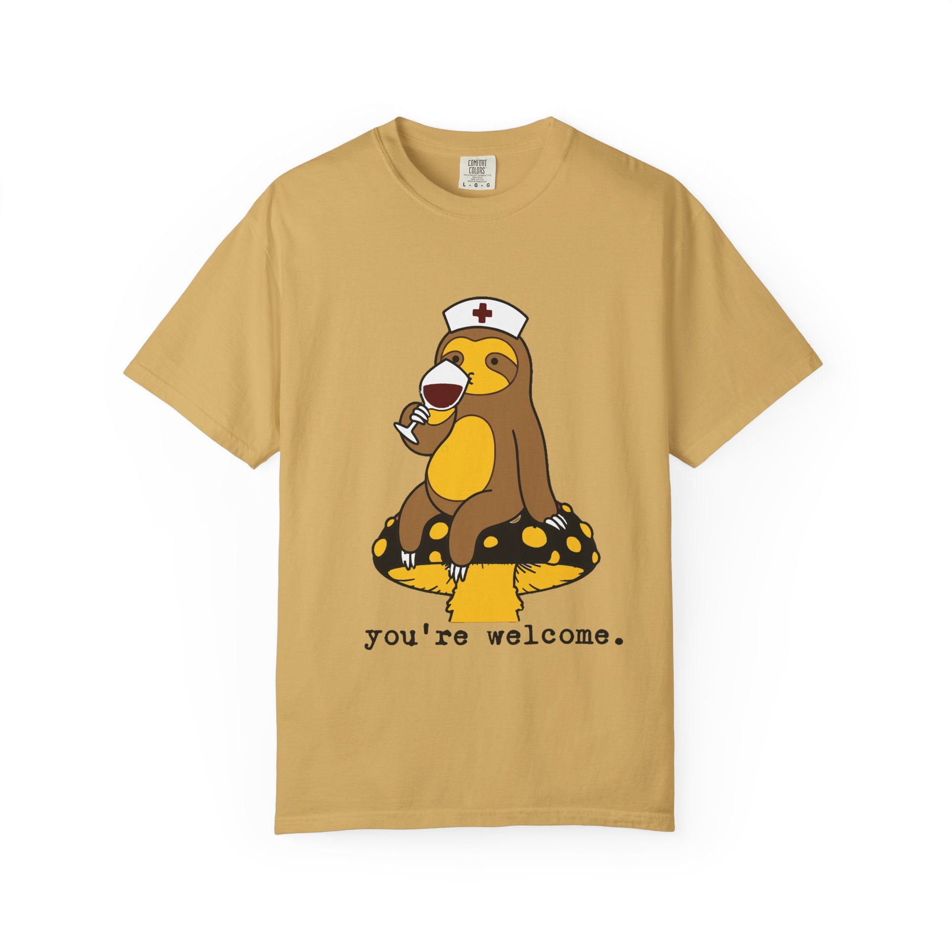 This soft, garment-dyed tee features an original illustration of a sleepy sloth dressed as a nurse, with a small, wry caption — a quiet, warm nod to caregivers who move at their own steady pace. The muted, lived-in color and relaxed fit invite long shifts and slow Sundays alike. Wear it when you need a little humor and gentle appreciation after a long shift, or give it to the nurse who finds comfort in small, silly moments. The design sits comfortably on the chest, letting the art and message do the talking without shouting. It’s an approachable, everyday piece that feels like a familiar favorite straight away.