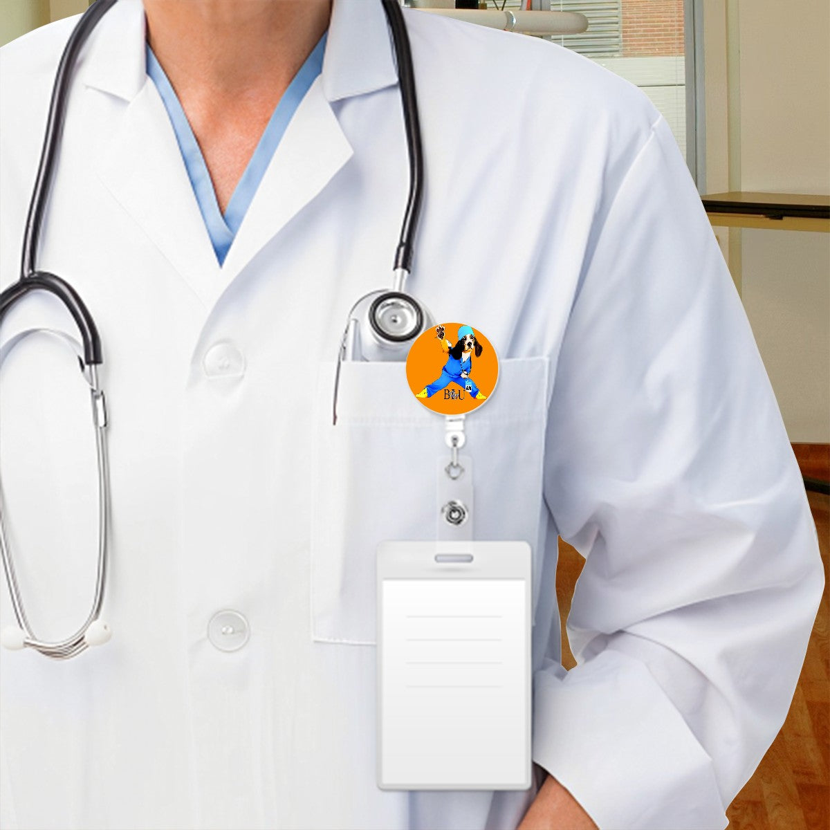 - This BluTokyo badge reel is a compact burst of motivation and charm—perfect for healthcare workers and dog-loving pros who want their gear to speak volumes. The bold orange background frames the Blutokyomedical.com logo, Blu in scrubs, paw raised like he’s ready to tackle the day, reminding wearers to stay authentic and proud.