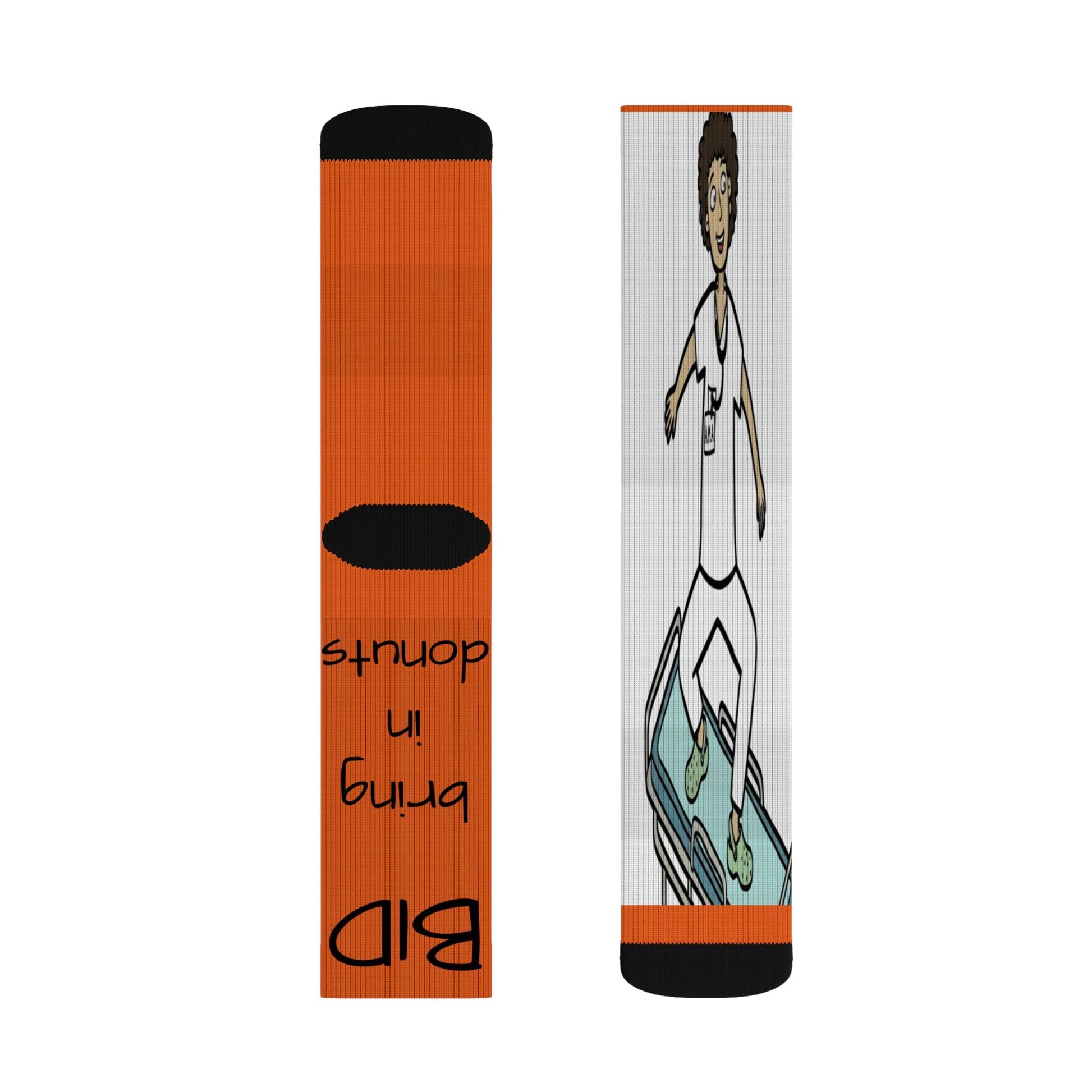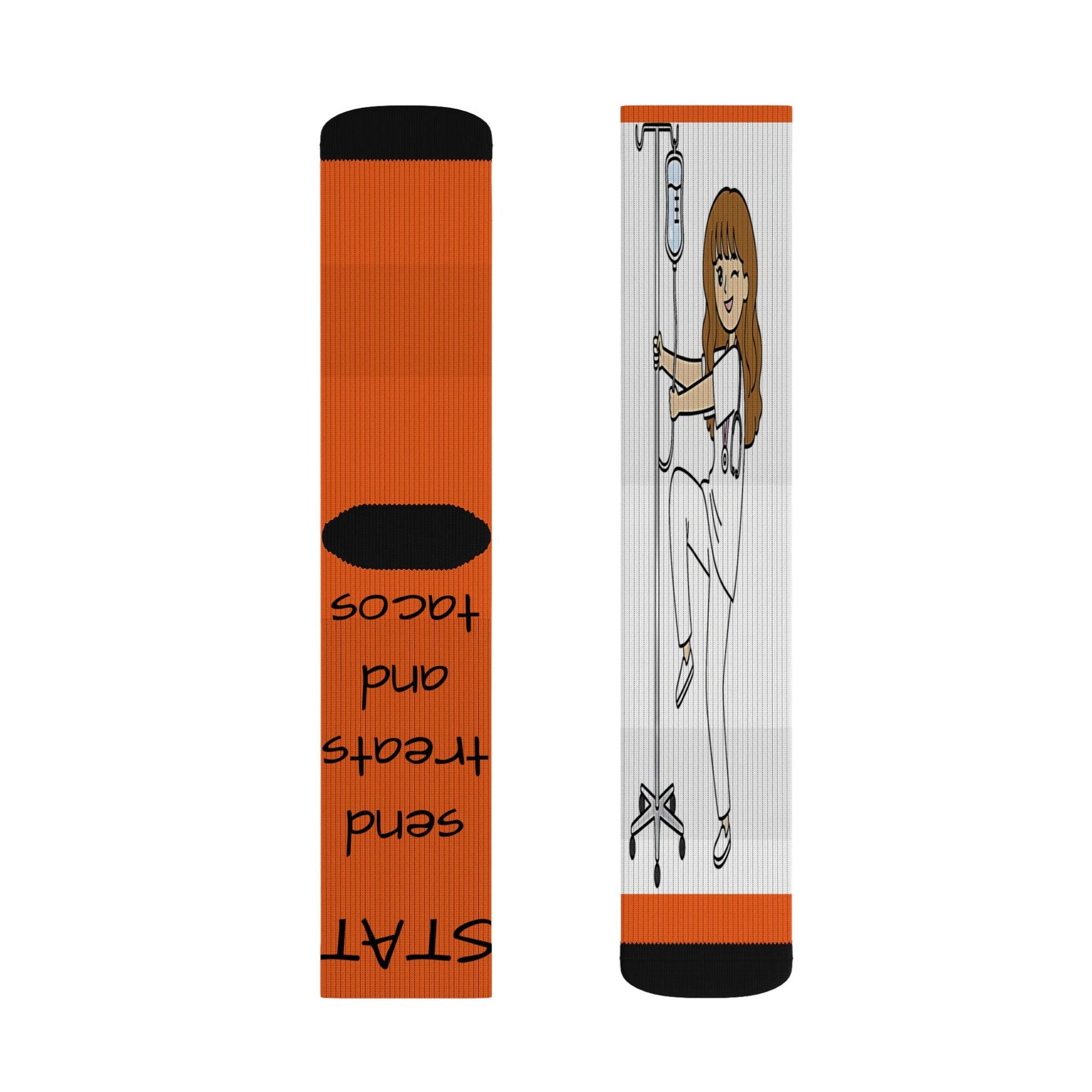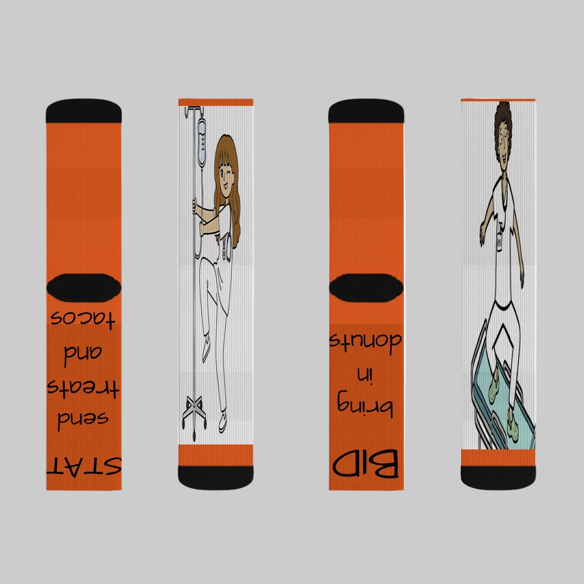 Funny Nurse Socks - Medical Tech Sublimation Socks with 'Bring In Donuts, Send Treats and Tacos' Design