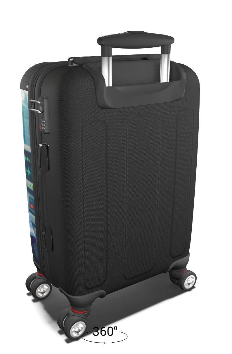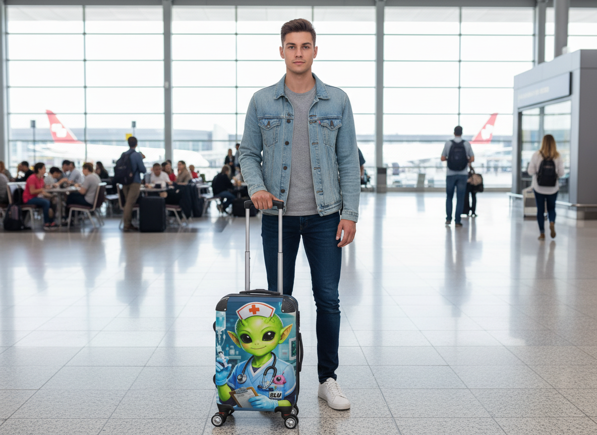 Blast off with the suitcase that brings pure cosmic joy to every shift, trip, and airport terminal. This vibrant design stars a green alien healthcare hero suited up in scrubs, rocking a stethoscope, holding a syringe, and carrying a clipboard like they’re ready to chart across galaxies.