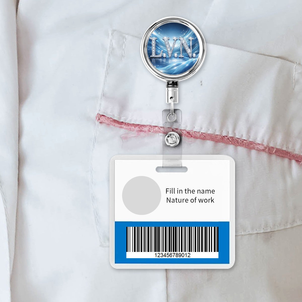 This badge reel shines with purpose. Featuring a dynamic blue backdrop and glittering “L.V.N.” initials, it’s made for Licensed Vocational Nurses who bring skill, heart, and hustle to every shift. Clip it on and let your care speak volumes.