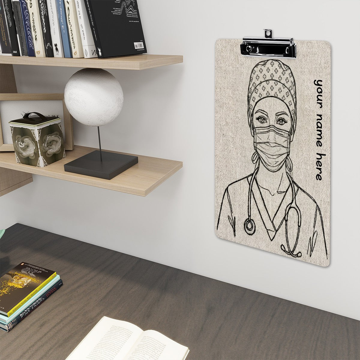 Celebrate the strength and compassion of healthcare heroes with our customizable clipboard featuring a line-art nurse in full PPE. Designed for everyday use in clinical settings, this 12.5-inch board offers a sturdy writing surface and a choice of clip styles. Add your name along the side to make it uniquely yours—because your care deserves recognition.
