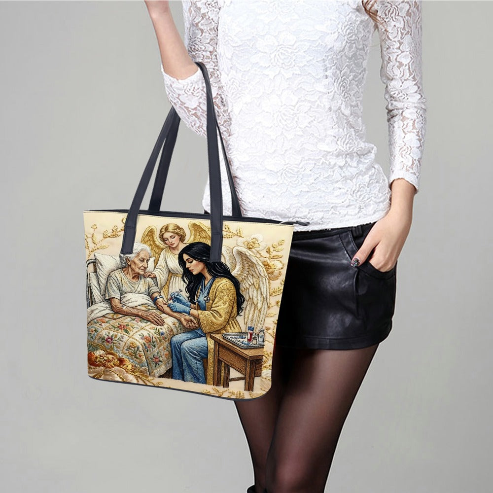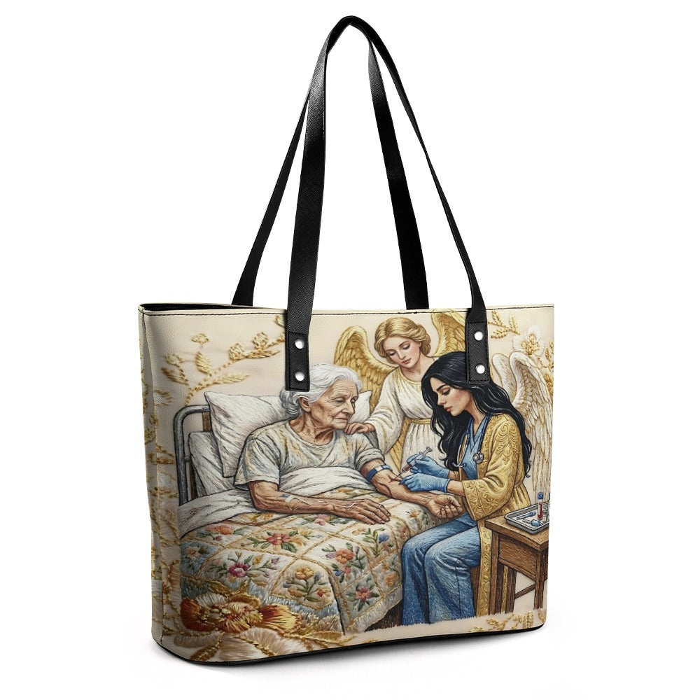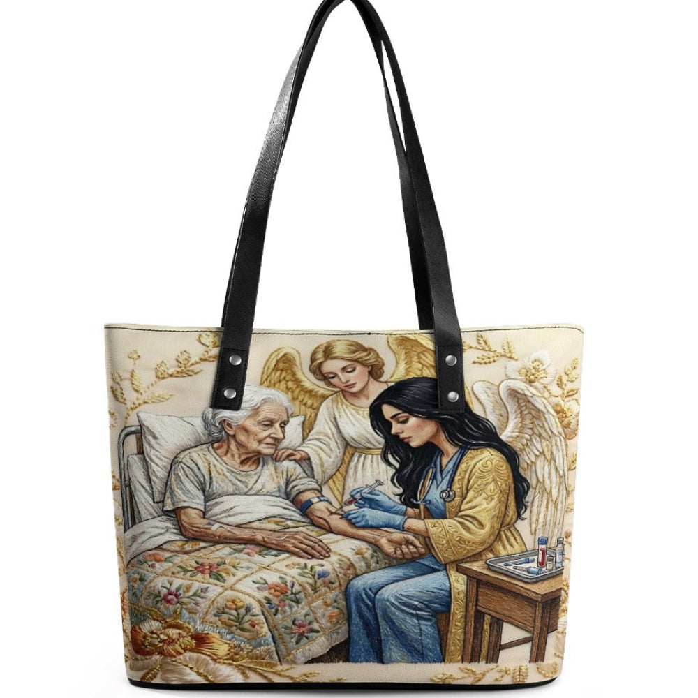 This striking leather handbag honors the frontline heroes whose care is both earthly and divine. With a vivid scene of a nurse in action, flanked by celestial protectors, it’s a bold statement piece for those who walk with purpose and heal with heart.