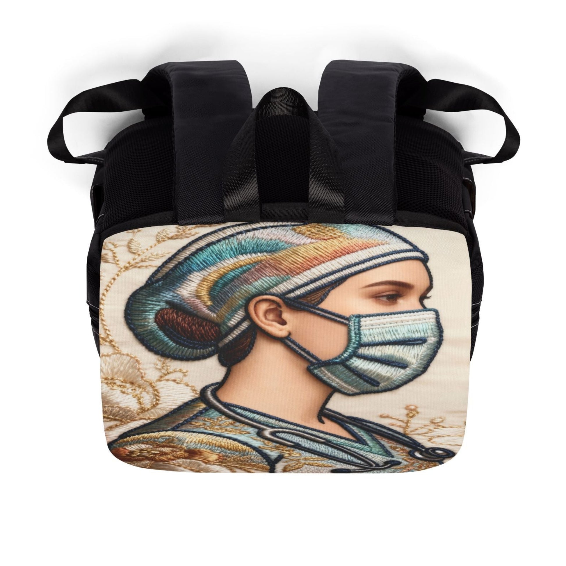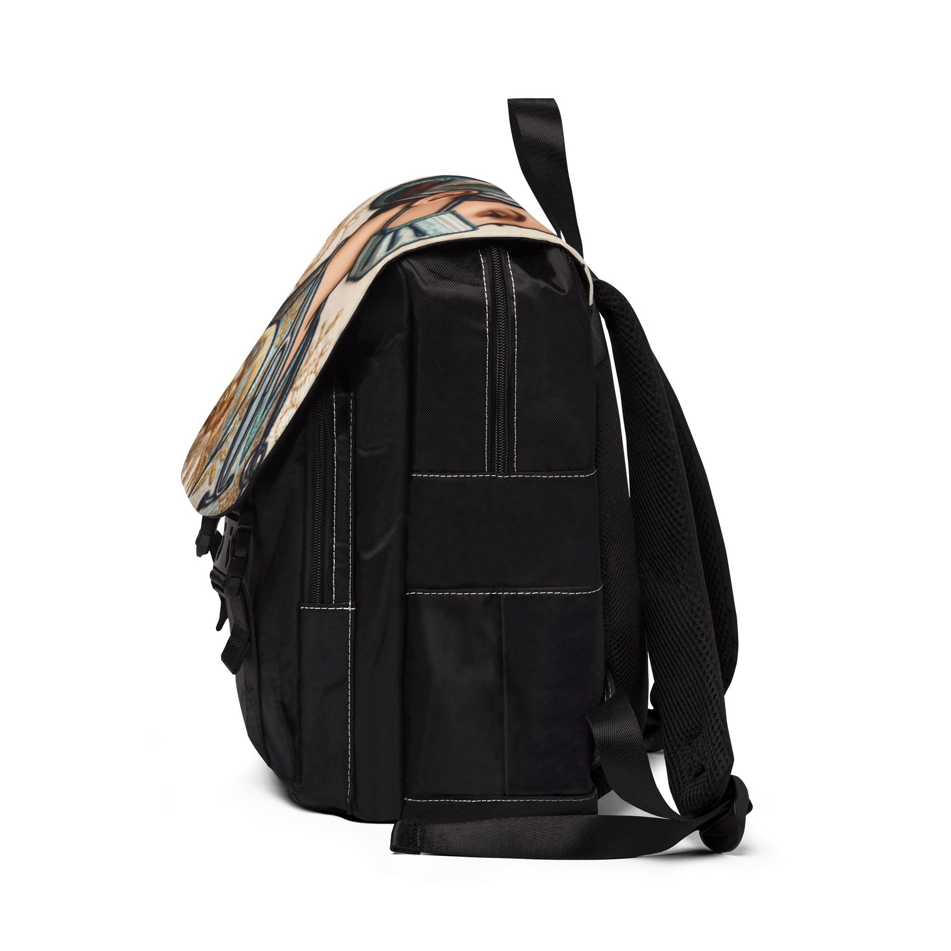 Elevate your everyday with the Masked Muse Backpack—a wearable canvas of care, culture, and quiet rebellion. Featuring a striking profile of a masked woman rendered in muted Renaissance tones, this bag blends classical elegance with modern grit. The artwork wraps across the flap and top panel, turning every angle into a statement of strength and style.