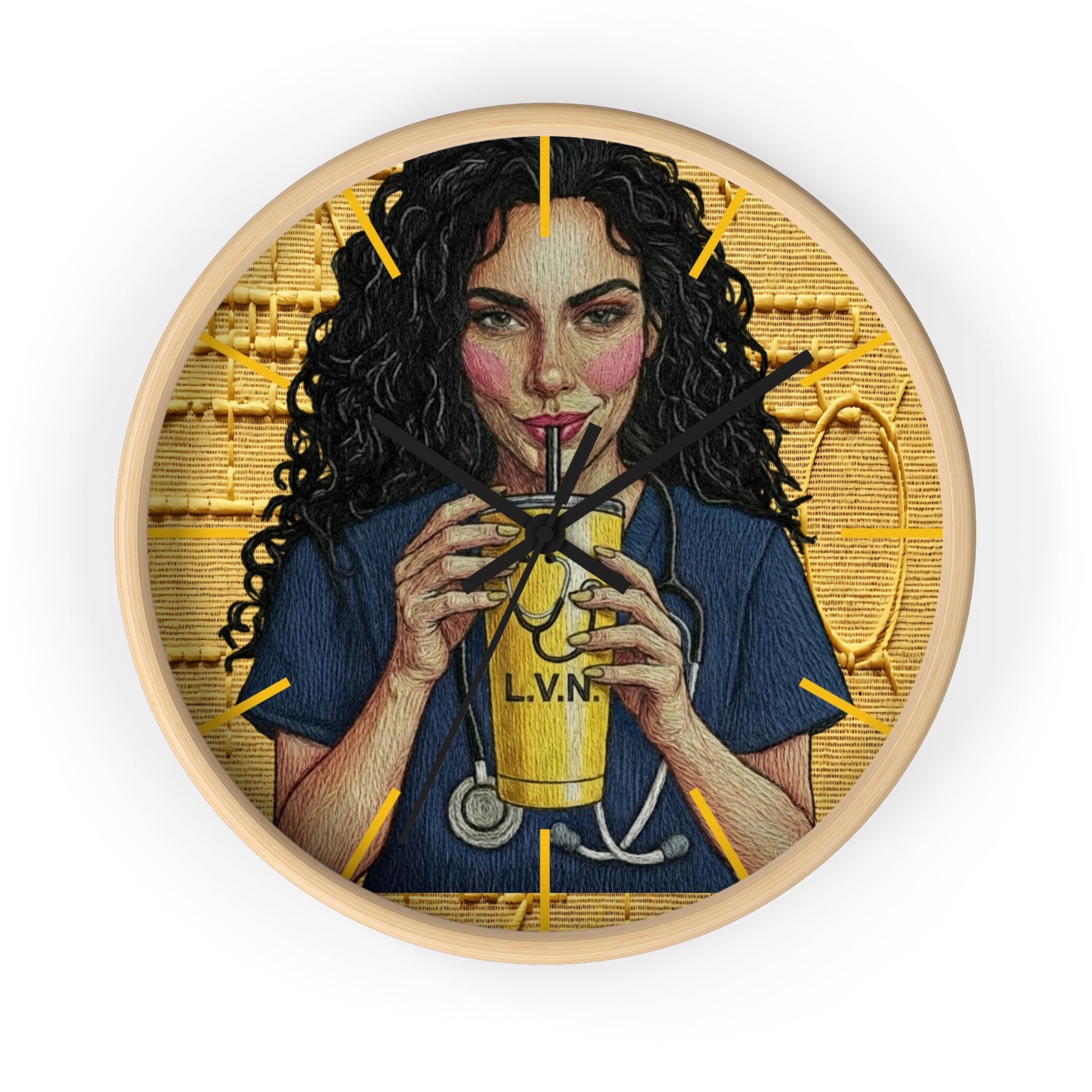 This 10" wall clock brings a warm, lived-in moment to any room — a confident nurse with curly hair, sipping from a cup marked “L.V.N.” against a textured, golden backdrop. The illustration feels like a snapshot between shifts: quiet pride, a needed pause, a little humor. It settles into kitchens, nurses’ stations, home offices, or break rooms and quietly honors the steady, human work behind scrubs. The subtle, silent mechanism keeps the scene calm; bold printing preserves every brushstroke and rosy highlight. Choose from natural wood, black, or white frames and match black or white hands to suit your wall. It arrives ready to hang — just add one AA battery — and stays indoors where the vibrant colors can be admired daily.