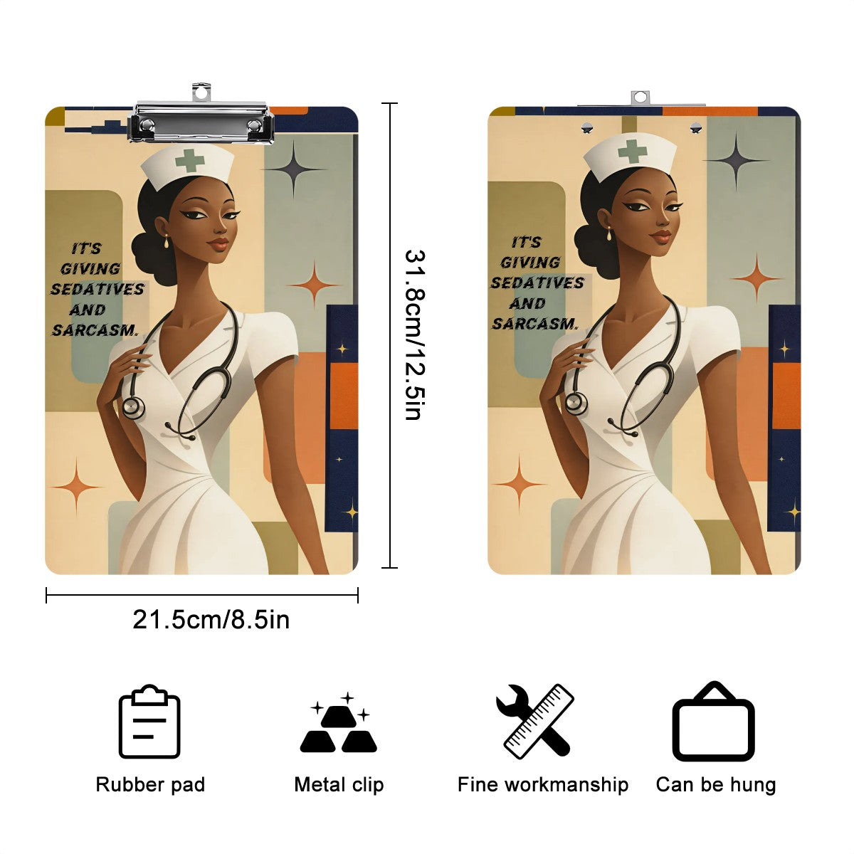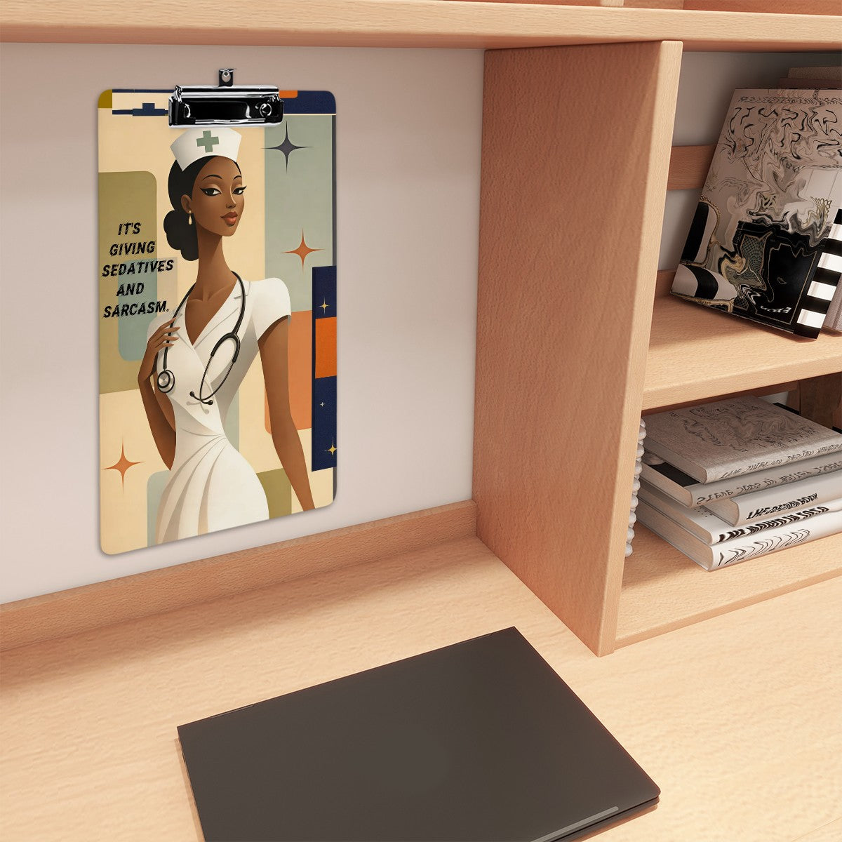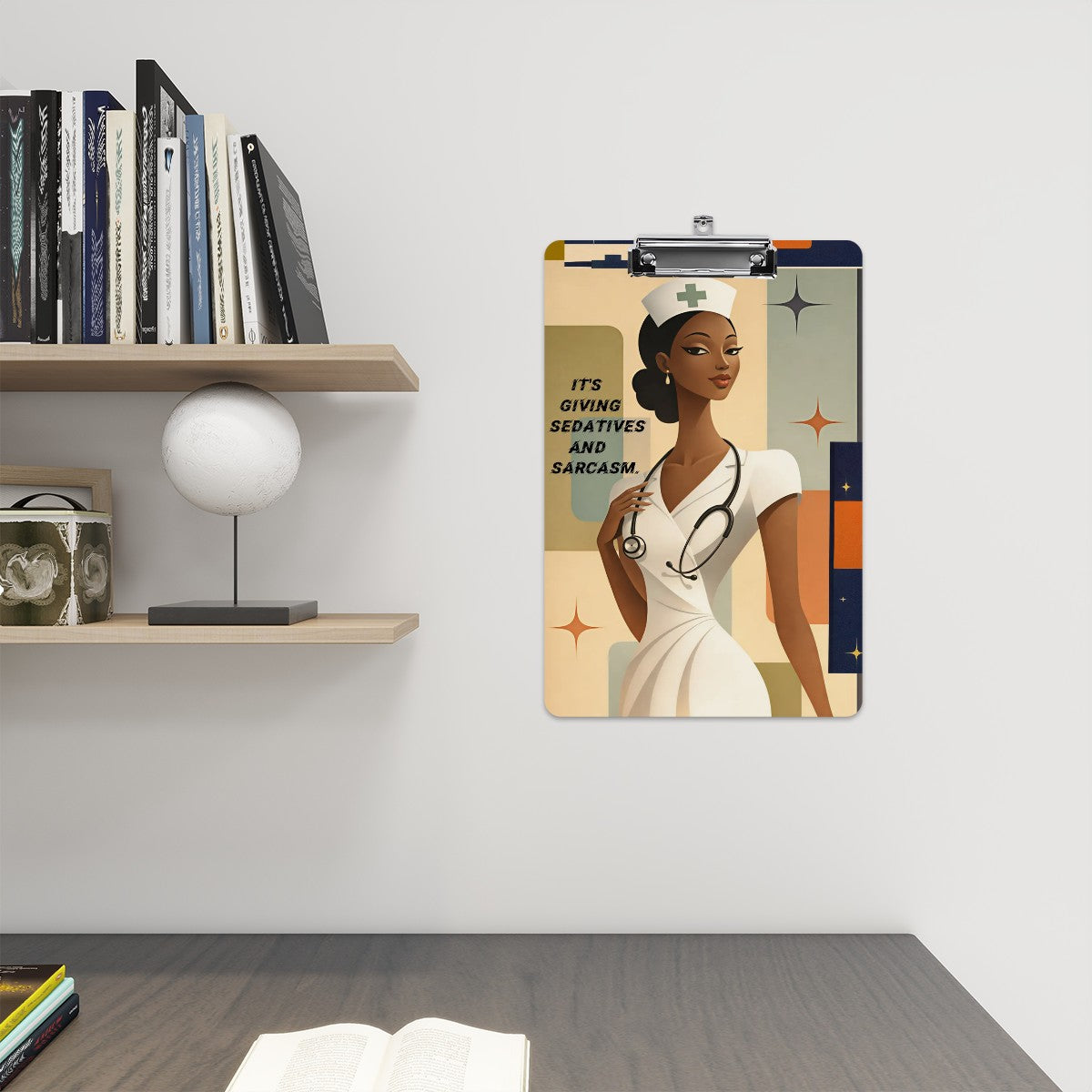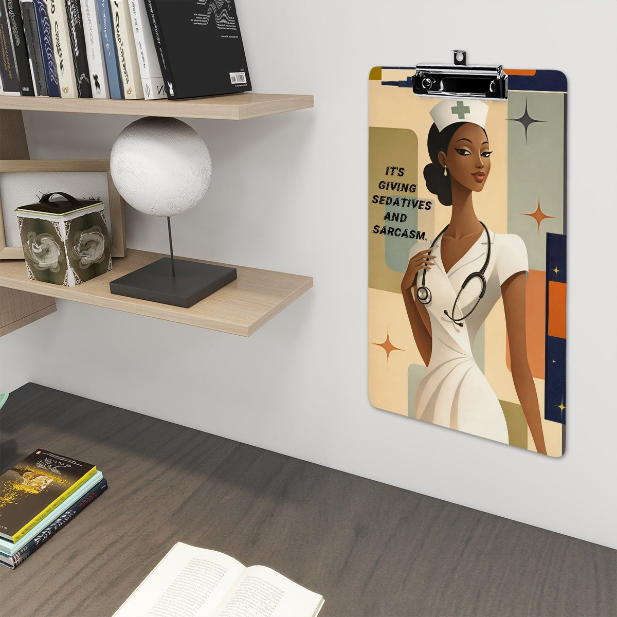 Channel vintage charm with a modern twist. This clipboard features a confident nurse in crisp whites, framed by a retro burst of muted oranges, greens, and blues. With the bold phrase “IT'S GIVING SEDATIVES AND SARCASM,” it’s perfect for healthcare professionals who lead with skill and sass. Whether clipped to charts or displayed as desk decor, it’s a daily dose of humor and style for nurses who do it all—with attitude.