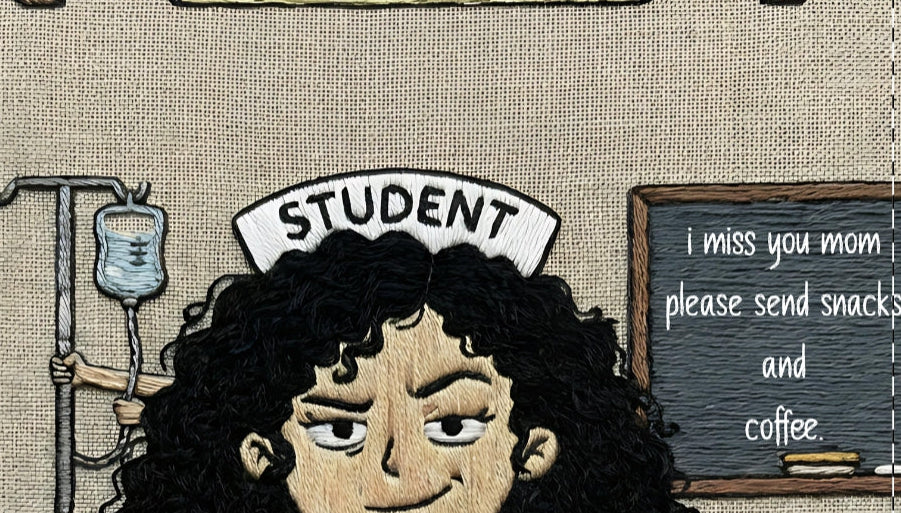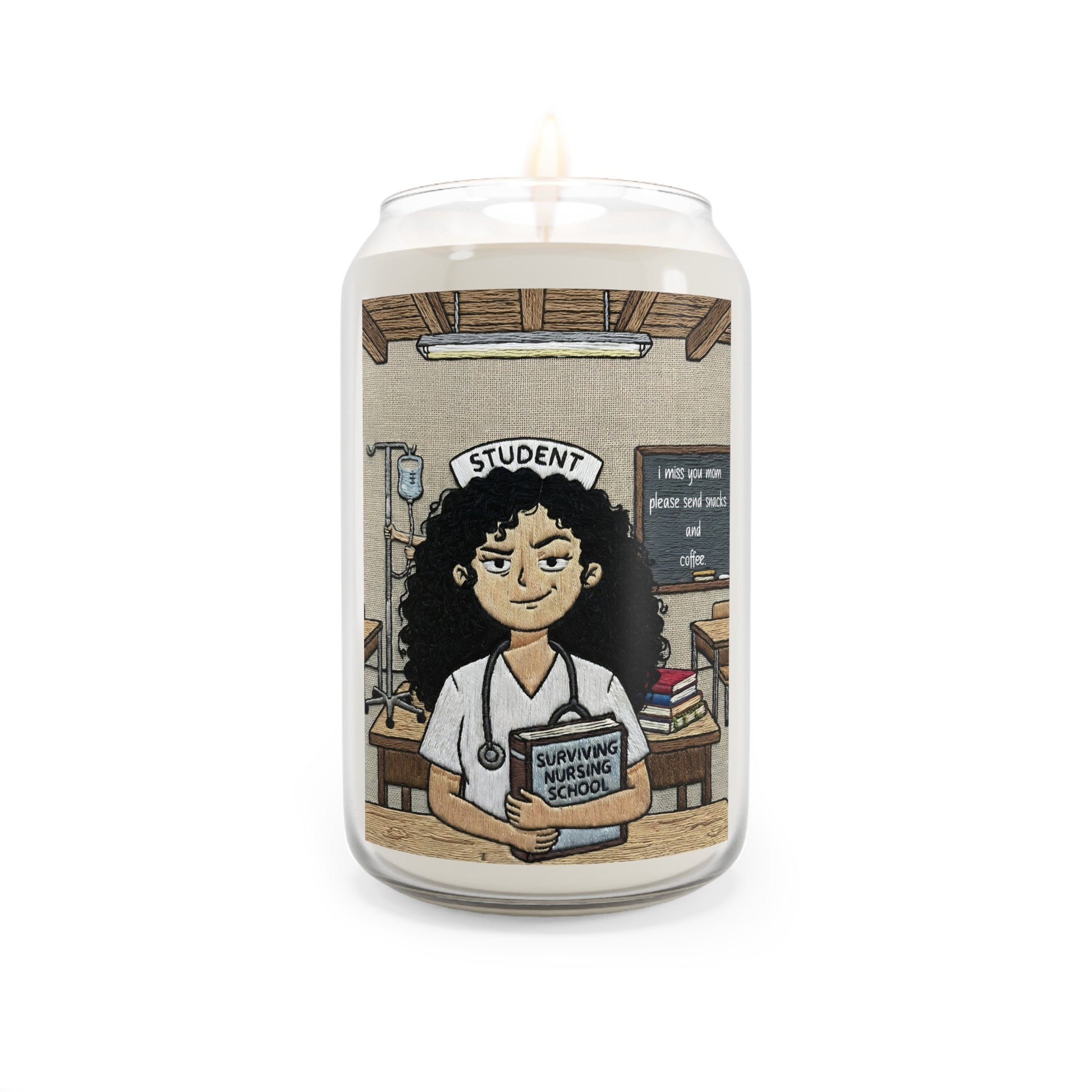 For every nursing student who’s cried into their coffee and whispered “send snacks” to the void—this candle gets it. Featuring an embroidered-style label of a curly-haired student in crisp whites, clutching a survival guide beneath a chalkboard confession (“i miss you mom / please send snacks / and coffee”), this design is a love letter to the grind. Light it during late-night crams, clinical prep, or existential spirals. You’re not alone. You’re becoming. It’s hand-poured from USA-grown soy, burns cleanly on a 100% cotton wick for roughly 70–80 hours, and arrives in a simple gray gift box. Keep the jar for pens, plants, or bedside trinkets once the wax is gone.