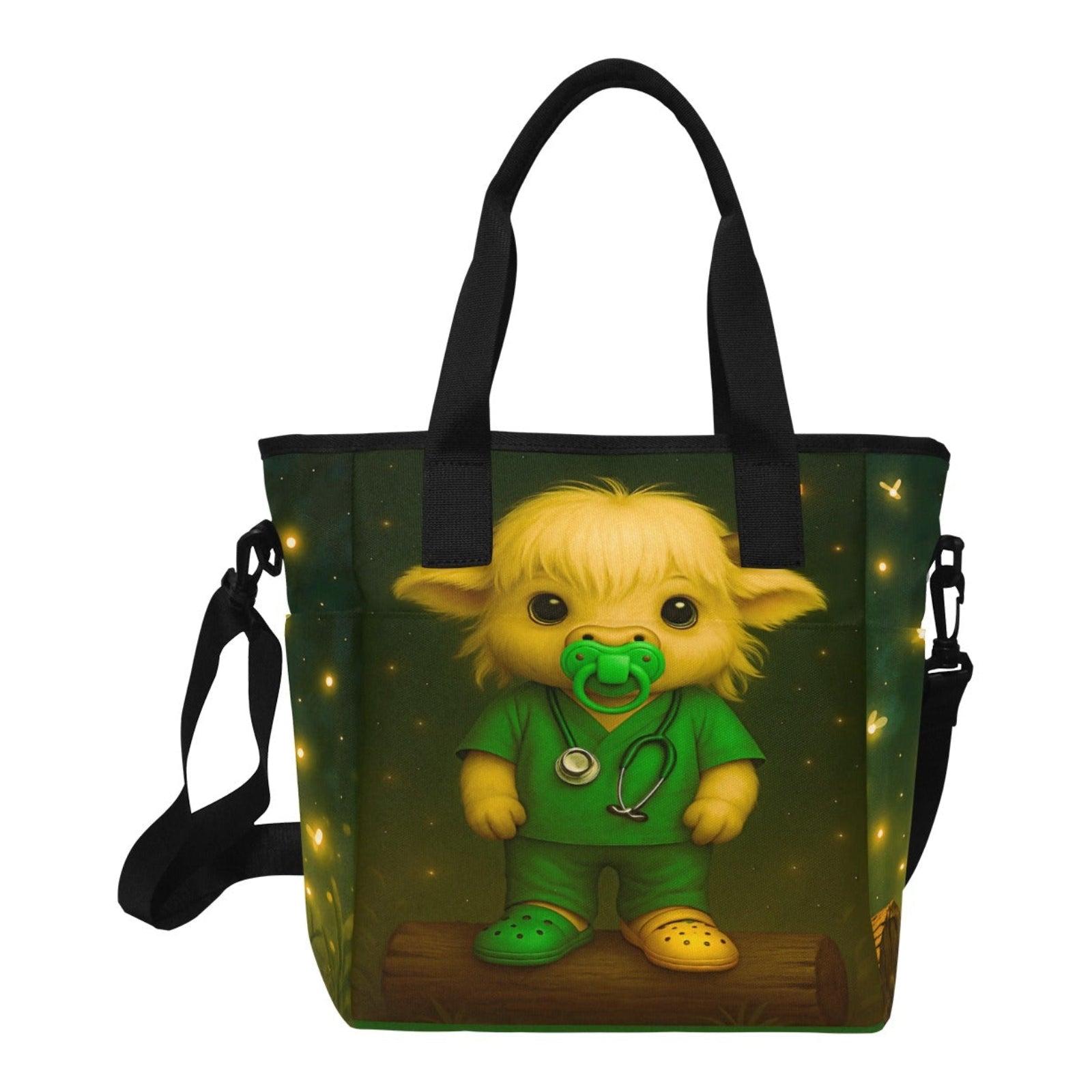 Meet your new on‑shift sidekick. This whimsical little scrub‑wearing creature brings comfort, charm, and a spark of magic to your day. With glowing accents, a stethoscope around its neck, and a pacifier for extra sweetness, this tote blends fantasy and healthcare pride in true BluTokyo style. Spacious, durable, and irresistibly cute.